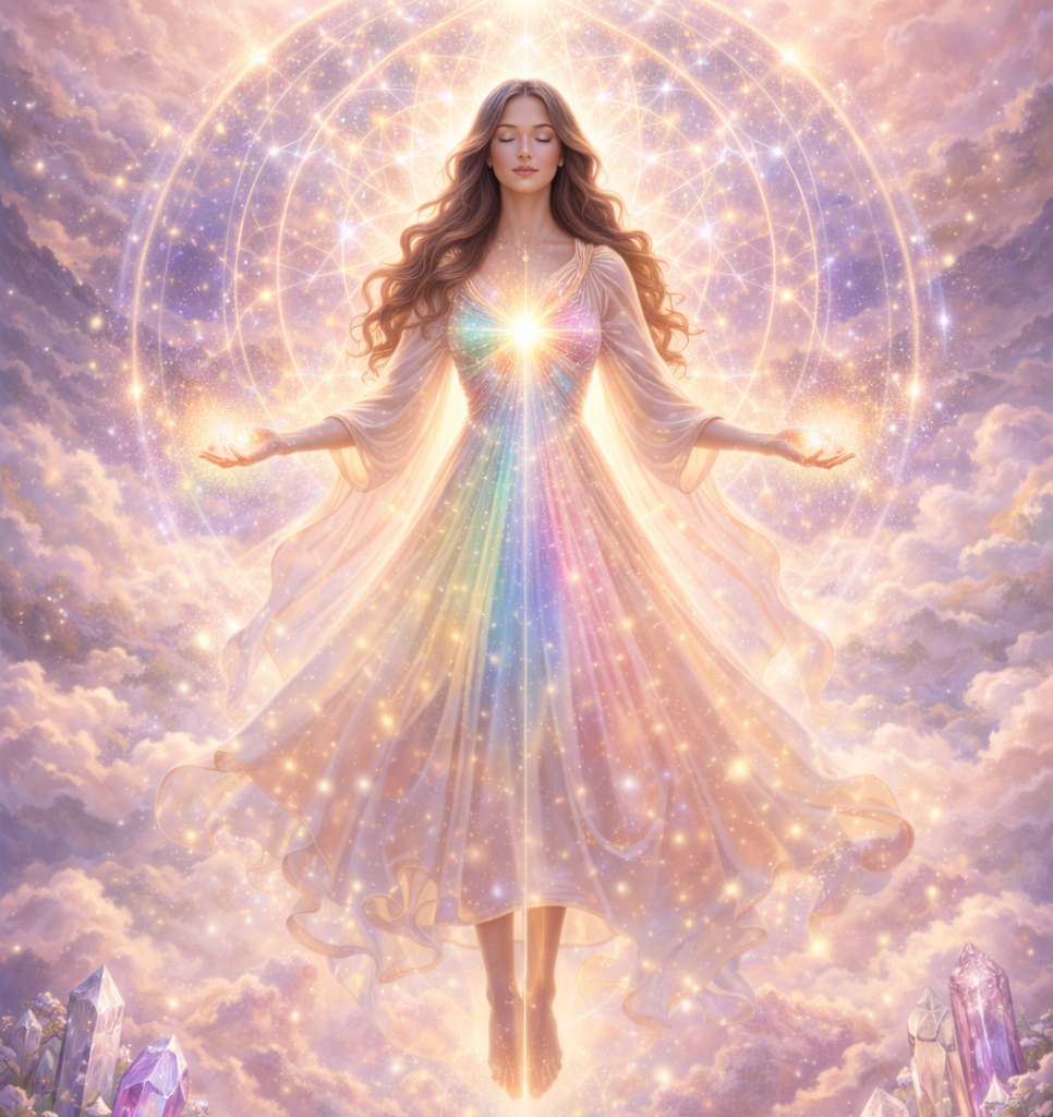 Experience divine light flowing from above into the body. This practice anchors higher consciousness into matter—cleansing, healing, and integrating spiritual awareness with physical form for embodied enlightenment.